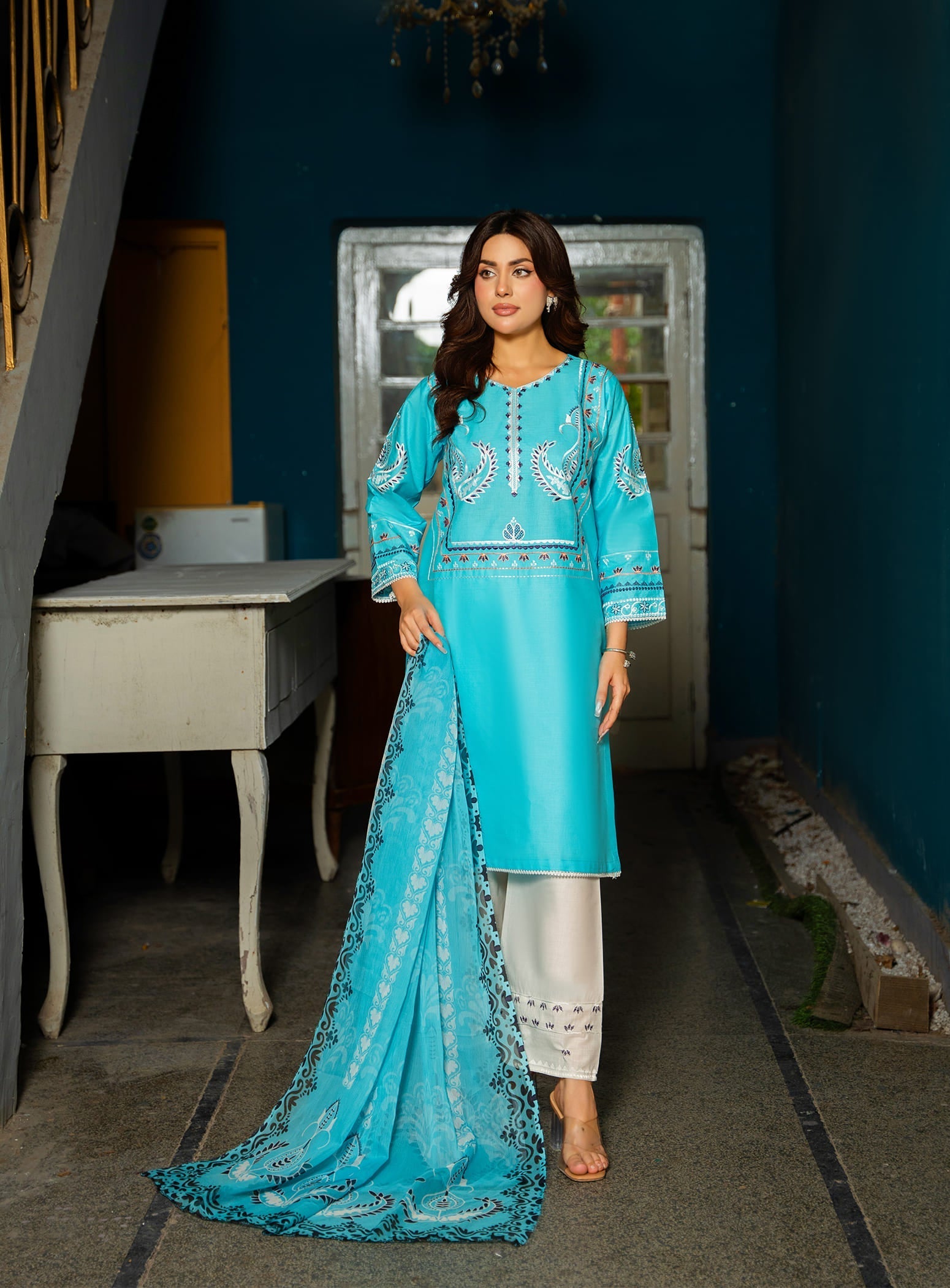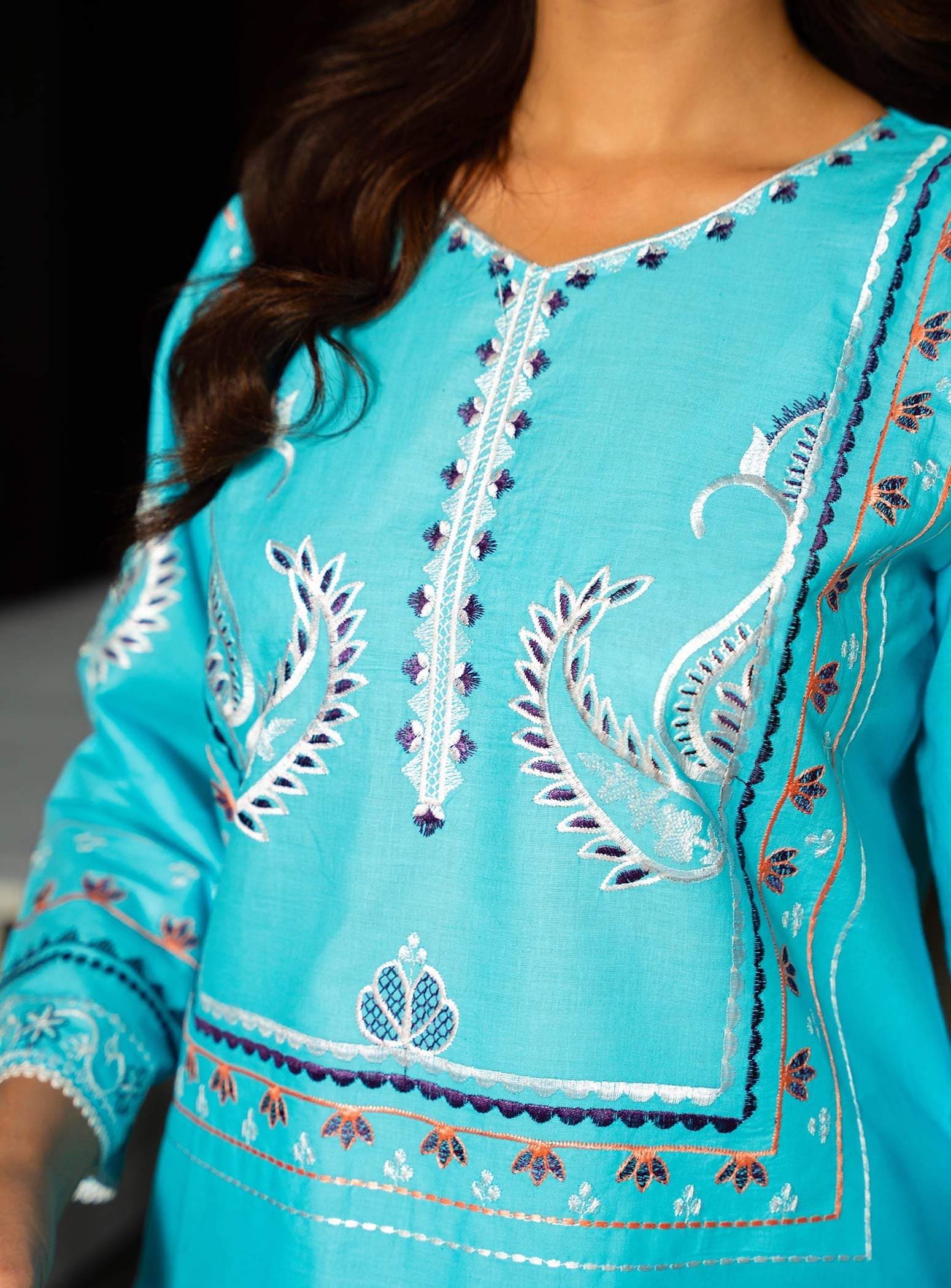 Made from breathable cotton fabric, this aquamarine ensemble features a beautifully embroidered straight cut kurta with a matching straight trouser. The look is completed with a stunning digital printed dupatta, adding a vibrant yet graceful touch โ making it a perfect choice for summer wear.